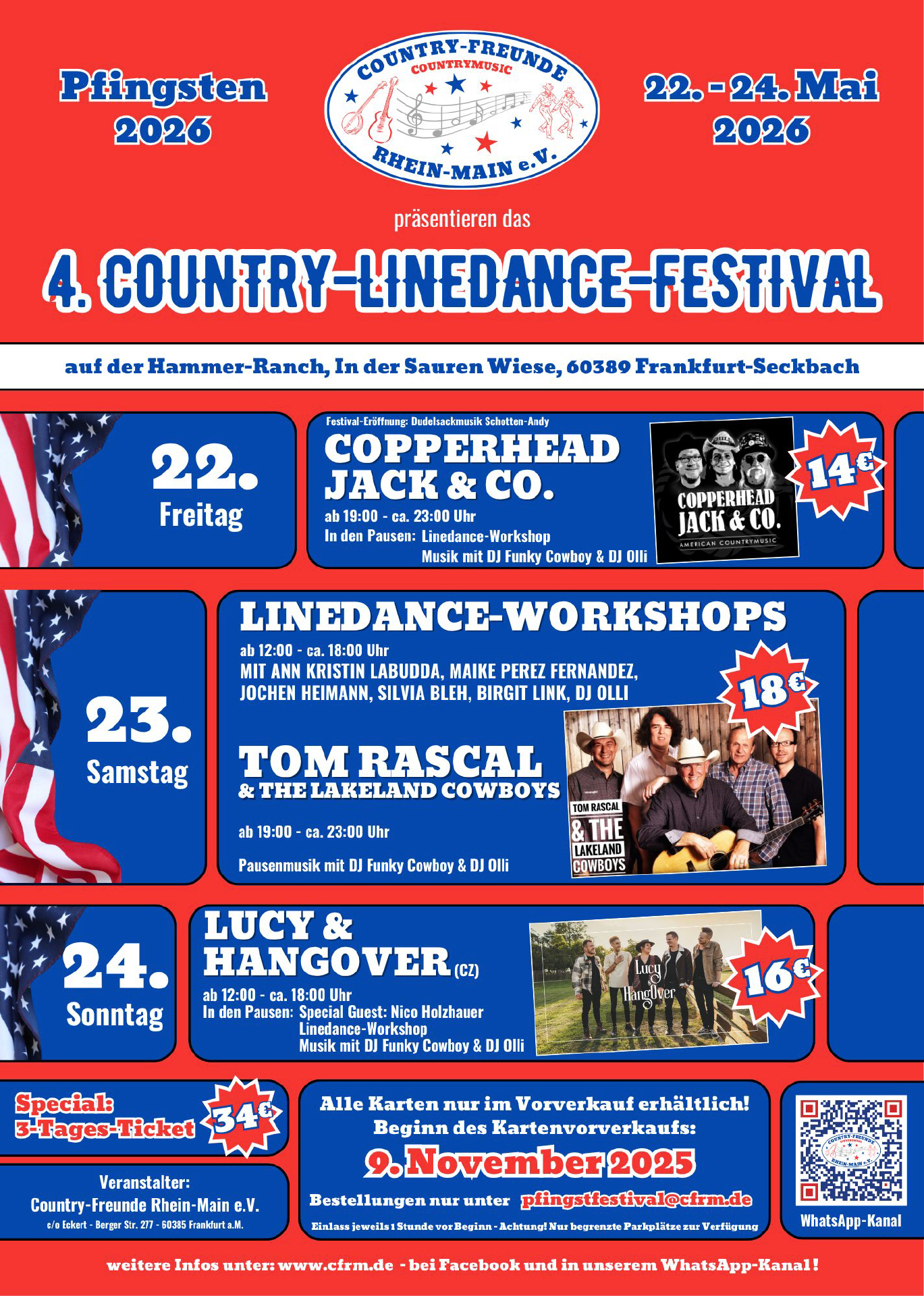 22.05.2026: 4. Country-Linedance-Festival, Country-Freunde Rhein-Main (22. bis 24.05 26), Hammer Ranch, 60389 Frankfurt - Seckbach, In der Sauren Wiese (Copperhead Jack, Tom Rascal & The Lakeland Cowboys, Lucy & Hangover) 19 Uhr [mehr] |